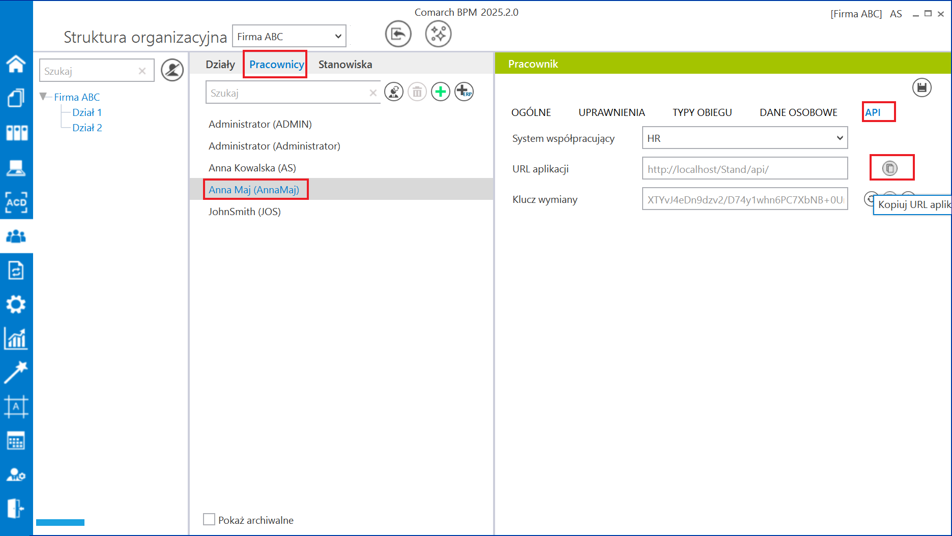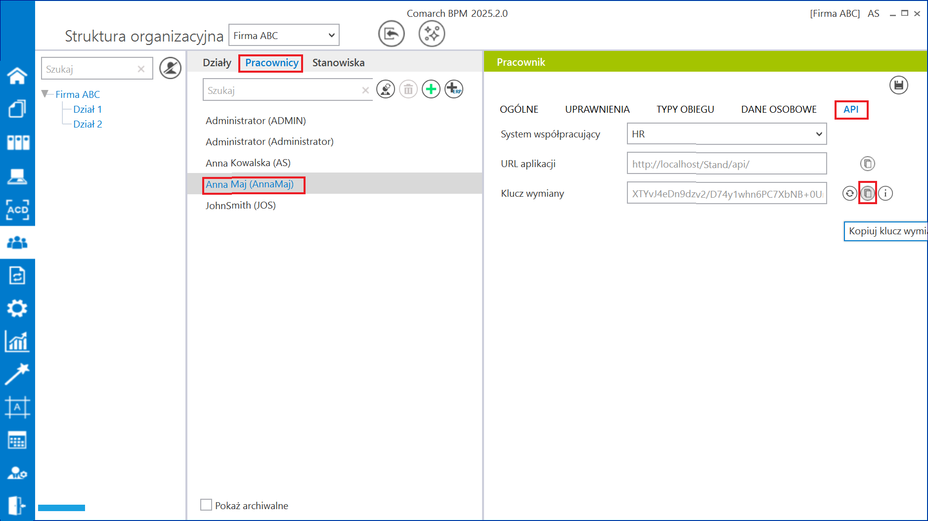 1. zalogować się do Comarch BPM (dawniej DMS) desktop jako administrator Comarch BPM (dawniej DMS) ; 2. wybrać spółkę Comarch ERP Optima 3. wybrać kartę pracownika, którego konta użyto do integracji z systemem współpracującym z Comarch HRM (zob. Zakładka API na karcie pracownika – integracja BPM z HRM); 4. w zakładce „API” nacisnąć przycisk