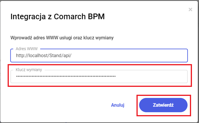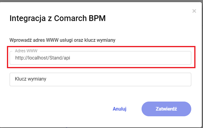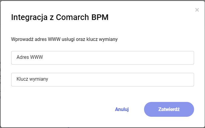 Zostanie wówczas otwarte okno Integracja z Comarch BPM, w którym znajdują się dwa pola: