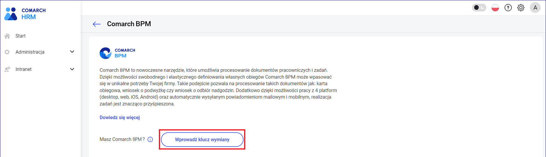Skopiowany w ten sposób klucz wymiany należy wkleić w polu Klucz wymiany w oknie Integracja z Comarch BPM w Comarch HRM.