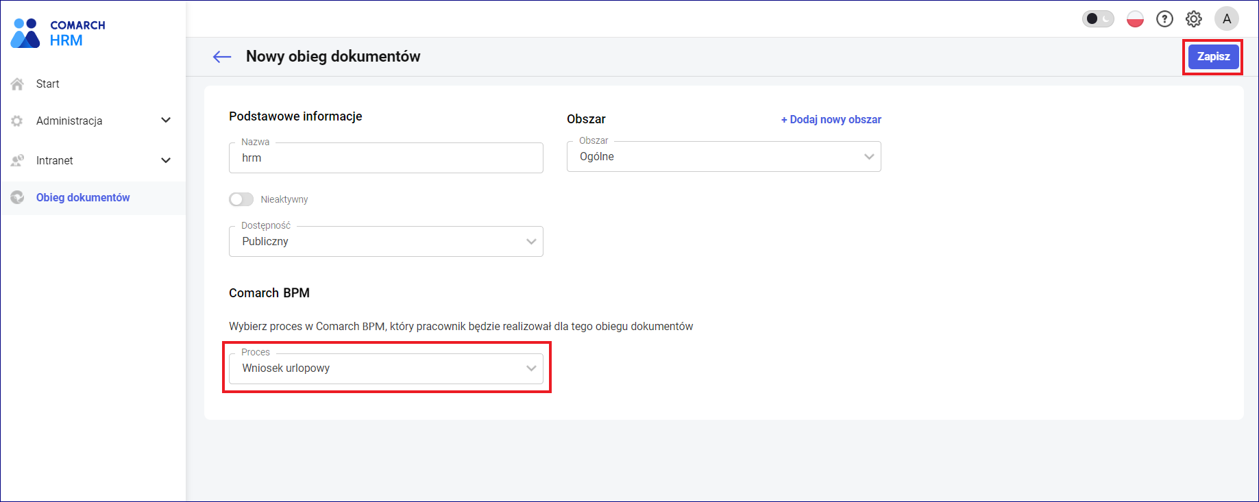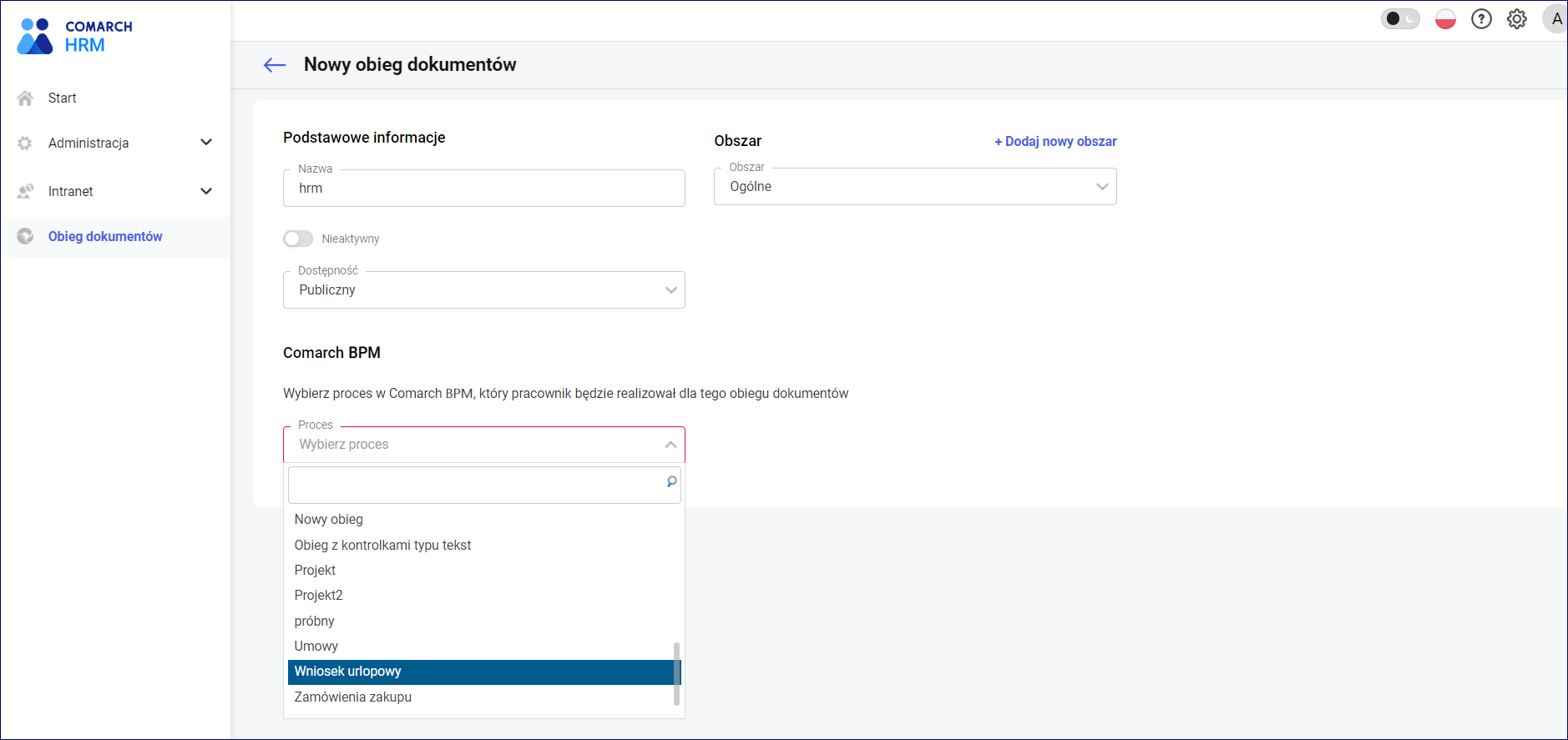 - Proces – pole, w którym z rozwijanej listy typów obiegów dostępnych w Comarch BPM (dawniej DMS) należy wybrać ten typ obiegu, w ramach którego przez pracowników HRM będą tworzone nowe dokumenty