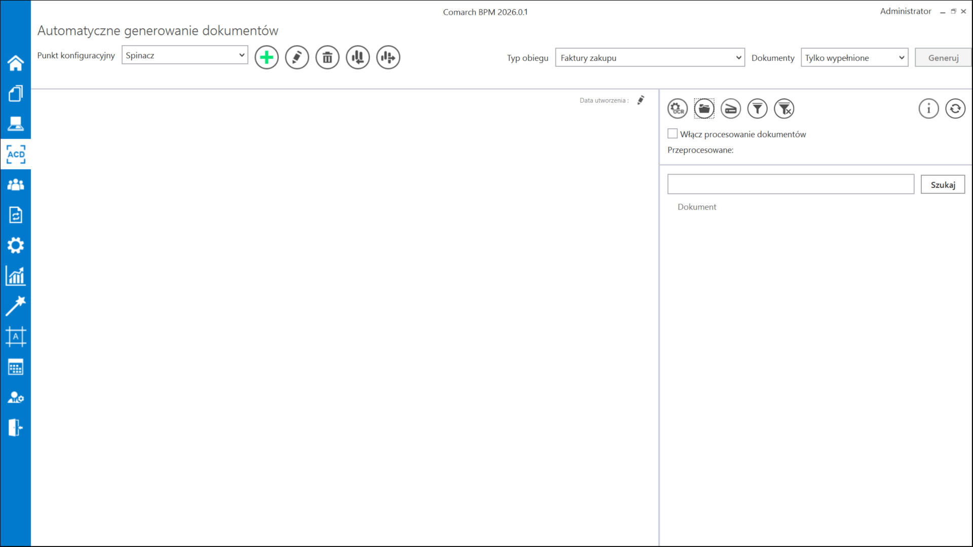 [Automatyczne generowanie dokumentów], dostępnego dla następujących typów punktów ACD: „ Import dokumentów zakupu z KSeF”, „Współpraca z dowolnym programem OCR”, „Współpraca z Comarch OCR”. Pole zostało umieszczone na lewo od przycisku