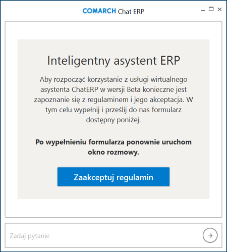 Jeśli formularz został niepoprawnie uzupełniony, wówczas po ponownym uruchomieniu ChatERP ponownie zostanie wyświetlone okno z przyciskiem „Zaakceptuj regulamin“.