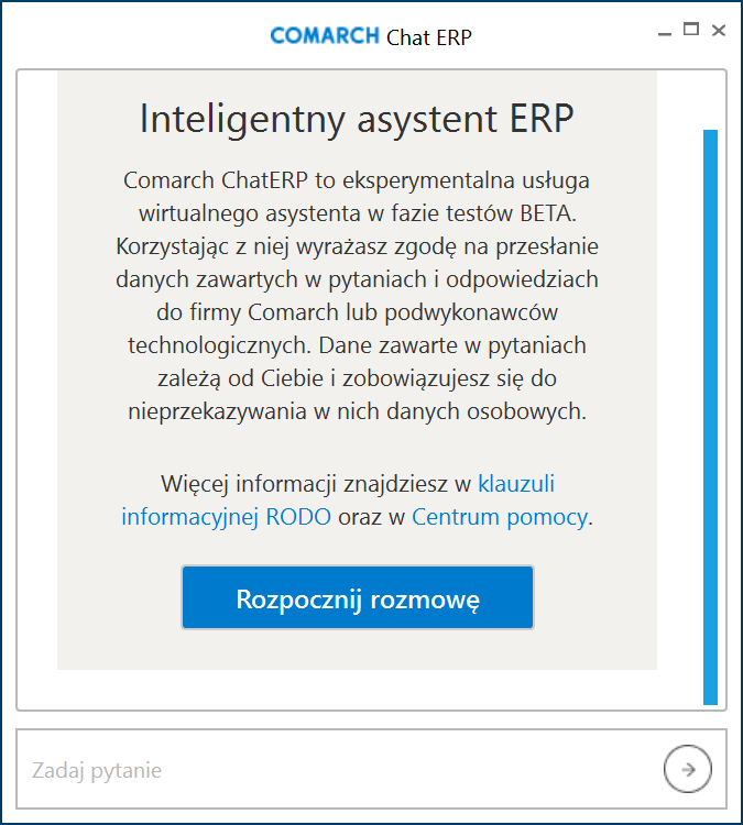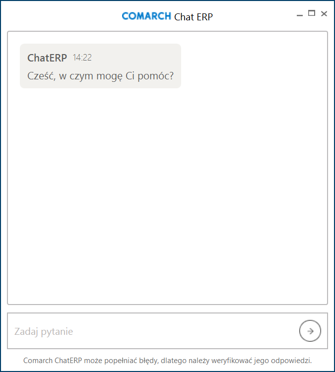 [Rozpocznij rozmowę]. Wówczas zostanie otwarte okno aktywnej konwersacji, w którym można prowadzić rozmowę z ChatERP. W dolnej części okna dodano komunikat: „ Comarch ChatERP może popełniać błędy, dlatego należy weryfikować jego odpowiedzi”. Takie okno będzie od tej pory wyświetlane wszystkim uprawnionym operatorom z danej spółki (o danym numerze NIP).