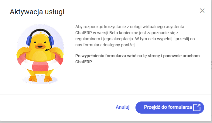 [Anuluj], wówczas po ponownym uruchomieniu ChatERP ponownie zostanie wyświetlone okno „Aktywacja usługi“ z przyciskiem „Zaakceptuj regulamin“.
