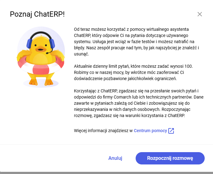 [Rozpocznij rozmowę]. Wówczas zostanie otwarte okno aktywnej konwersacji, w którym można prowadzić konwersację z ChatERP. W górnej części okna dodano komunikat: „Comarch ChatERP może popełniać błędy, dlatego należy weryfikować jego odpowiedzi”. Takie okno będzie od tej pory wyświetlane dla wszystkich uprawnionych operatorów z danej spółki (o danym numerze NIP).
