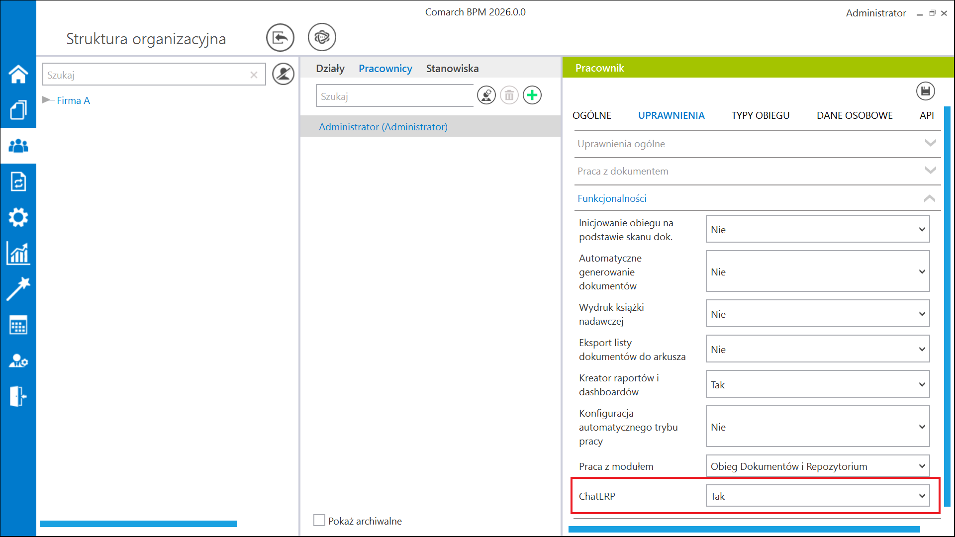 W wersji 2026.0.0 na zakładce [Struktura organizacyjna], na karcie pracownika, na zakładce „Uprawnienia”, w sekcji „Funkcjonalności” wprowadzono pole „ChatERP”, w ramach którego można zadecydować o dostępności ChatERP dla danego pracownika. Administrator może wybrać w ramach pola jedna z dwóch wartości: