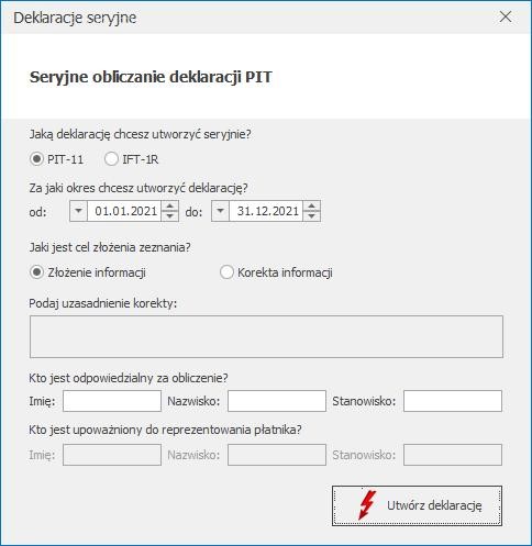 Seryjne wyliczenie dotyczy deklaracji: PIT-11, IFT-1R. Każdy rodzaj deklaracji generowanych jest wyłącznie dla zaznaczonych osób.