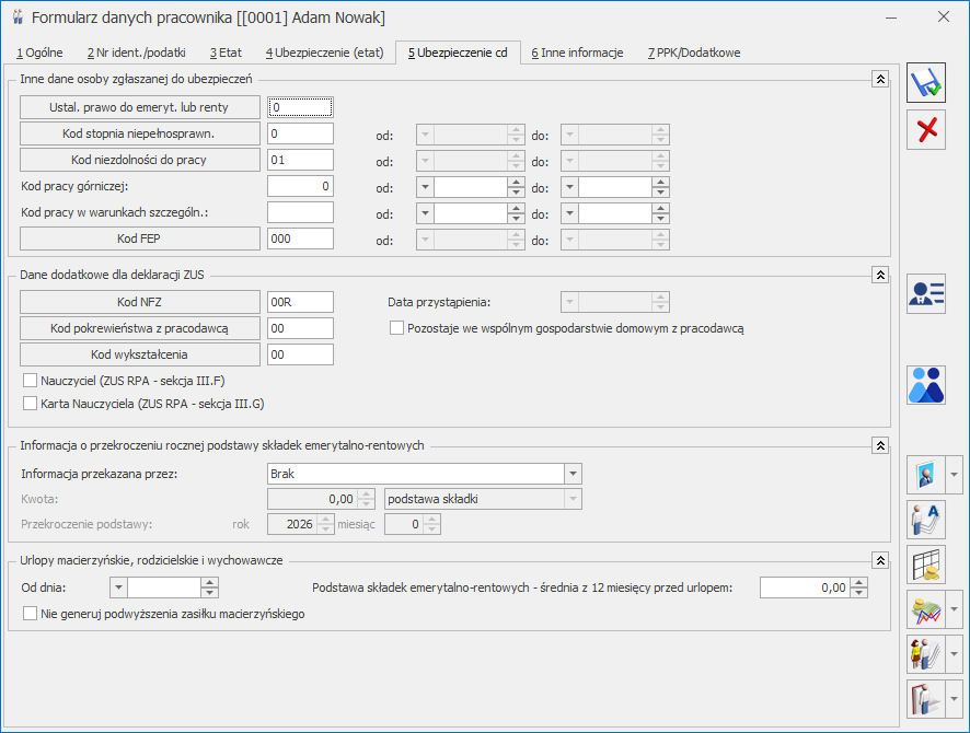 W celu poprawnego generowania deklaracji zgłoszeniowych i poprawnego wyliczania wynagrodzenia należy uzupełnić także dodatkowe informacje o ubezpieczeniu pracownika. Na zakładce tej określamy, czy osoba ma: