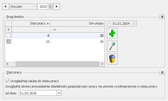 Ponadto znajduje się parametr: Uwzględniaj okresy prowadzenia działalności gospodarczej i pracy na umowie cywilnoprawnej w stażu pracy od dnia. Parametr ten posiada opcje: 01.01.2026 oraz 01.05.2026 (domyślnie).