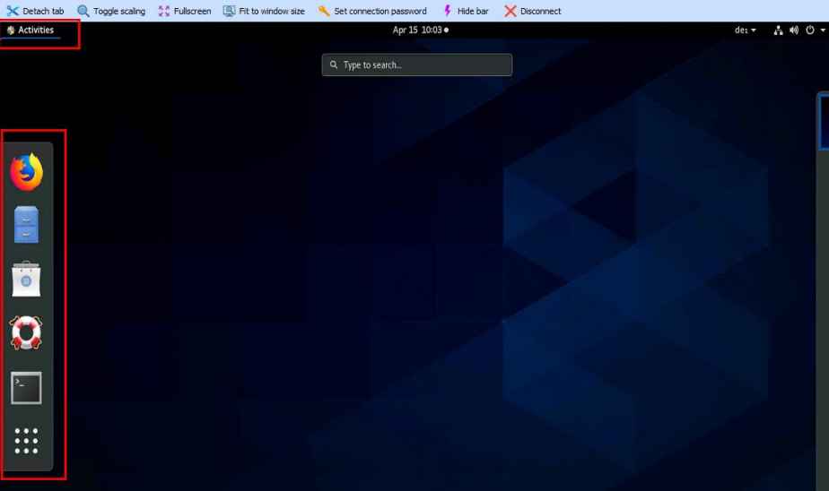 - Z poziomu Activities należy wybrać aplikację Terminal (jest to sesja CLI w RDP).
