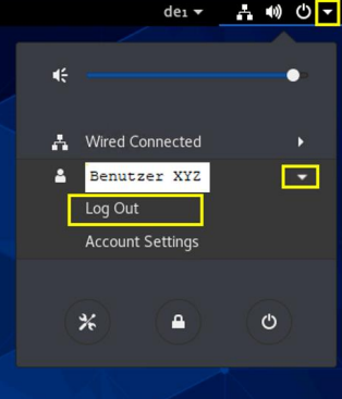 Poprawne wylogowanie następuje po kliknięciu strzałki w prawym górnym rogu i wybraniu przycisku [Log Out], dostępnym pod nazwą użytkownika.