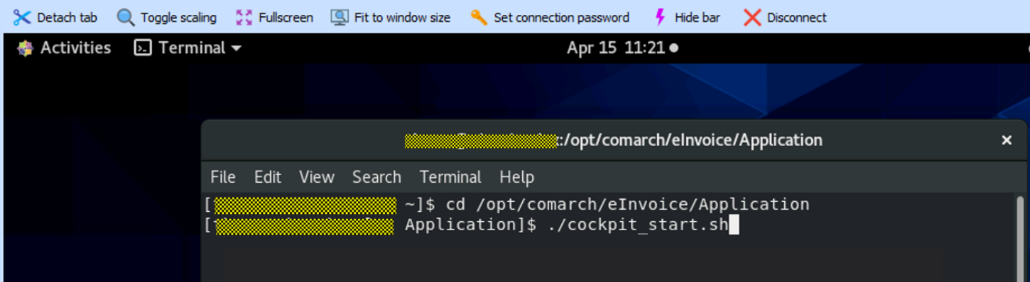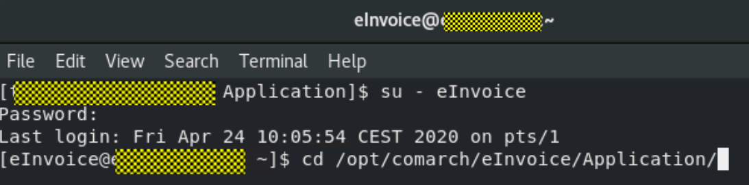 - W terminalu należy zmienić katalog na katalog instalacyjny, przykładowo cd/opt/comarch/eInvoice/Application.