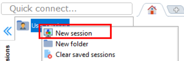 Klikając prawym przyciskiem myszy na zakładkę User sessions, definiuje się nowe połączenie (sesję) z serwerem Linux typu RDP.