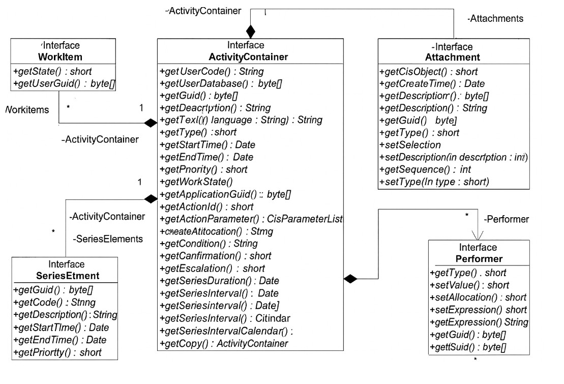 Workitem – jeśli dana aktywność jest typu STANDARD lub SERIES_ELEMENT, może posiadać przypisane zadania. Interfejs Workitem zapewnia niemodyfikowalny widok zadania — oznacza to, że pozwala jedynie na odczyt danych, bez możliwości ich zmiany. Za pomocą tego interfejsu można uzyskać informacje o statusie zadania, osobie realizującej oraz momentach zmiany statusu (te elementy nie są pokazane na diagramie).