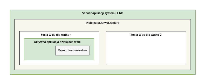 Podczas inicjalizacji kolejki przetwarzania rezerwuje się tyle wątków, ile zdefiniowano w konfiguracji systemu. Wartość 0 oznacza, że kolejka przetwarzania nie zostanie uruchomiona. Gdy zostanie wykryte zwolnione zlecenie przetwarzania, tworzona jest sesja typu Przetwarzanie w tle, inicjalizowana informacjami środowiskowymi (np. użytkownik, aktywna baza danych OLTP), a następnie przypisywana do wolnego wątku. Ten wątek uruchamia aplikację działającą w tle wskazaną w zleceniu przetwarzania.