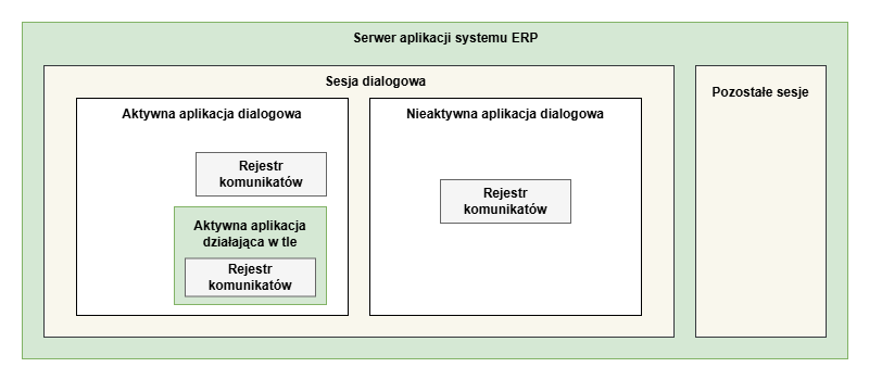 Aplikacja działająca w tle może wywołać inną aplikację działającą w tle. Aktywne aplikacje w sesji zawsze tworzą stos. Każda aplikacja na tym stosie reprezentuje własny kontekst, tj. posiada własną kolejkę komunikatów oraz własne blokady aplikacji. Sesje dialogowe mogą zawierać także nieaktywne aplikacje, które nie należą do tego stosu.