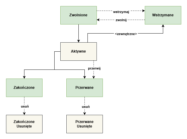Oprócz wyżej wymienionych statusów dostępnych jest także kilka dodatkowych statusów zarezerwowanych na potrzeby przyszłych funkcji w kolejnych wersjach. Poniższy diagram przedstawia statusy, działania realizowane podczas przejść między nimi oraz zdarzenia wyzwalające te przejścia.