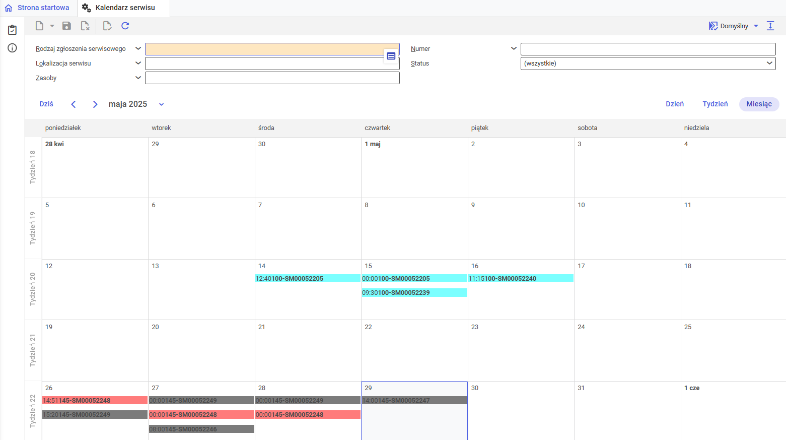 Aplikacja Kalendarz serwisu służy do prezentacji aktualnie zaplanowanych prac serwisowych. Umożliwia przegląd istniejących zgłoszeń serwisowych w różnych zakresach czasu (dziennych, tygodniowych, miesięcznym). Za jej pomocą możliwe jest również wygenerowanie nowych zgłoszeń serwisowych.