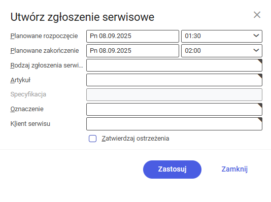 - Zatwierdzić dane przyciskiem [Zastosuj]. Zostanie utworzone zgłoszenie serwisowe ze zdefiniowanymi danymi.