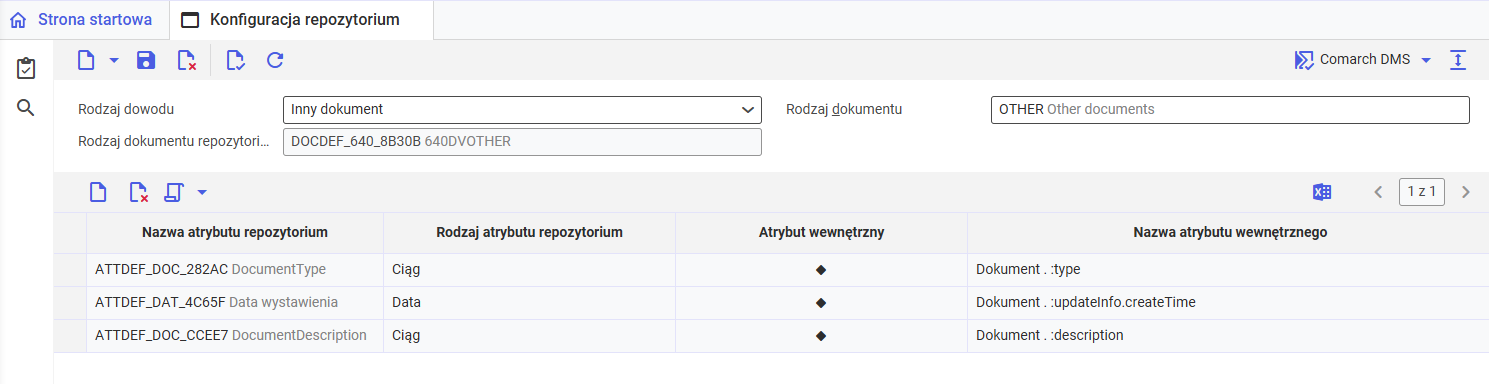 - Nazwa atrybutu repozytorium – wyświetlany jest atrybut repozytorium dla wybranego rodzaju dokumentu repozytorium