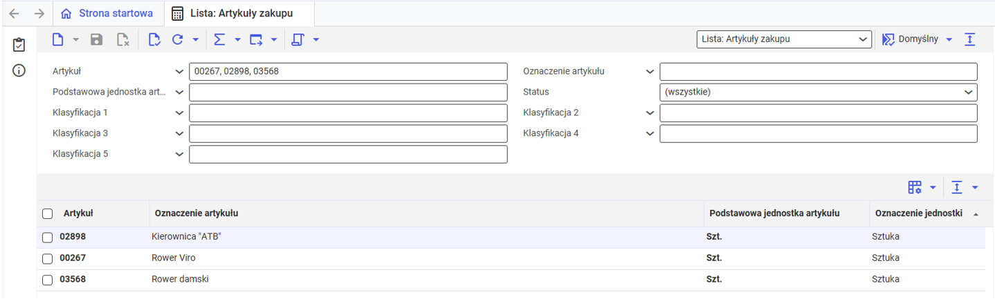- Klasyfikacja 1-5 – umożliwia filtrowanie wyników według artykułów z wybraną klasyfikacją 1-5 w aplikacji Artykuły → widok Zakup