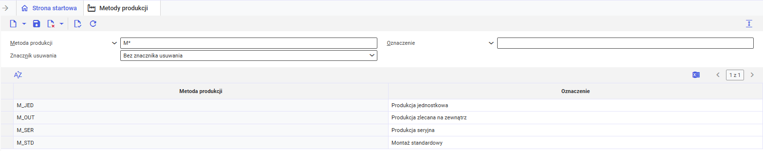 W nagłówku można wprowadzić kryteria wyszukiwania, a następnie za pomocą akcji [Aktualizuj] pobrać z systemu odpowiadające im metody produkcyjne i wyświetlić je w obszarze roboczym.