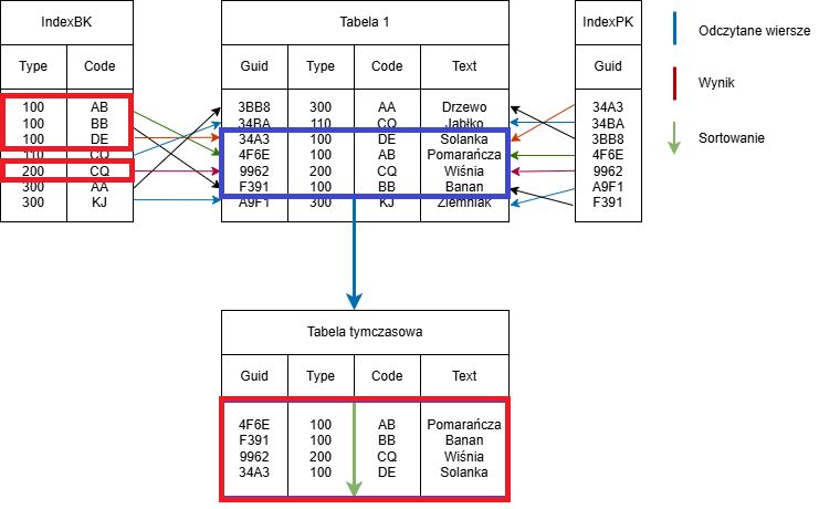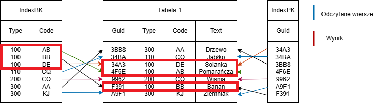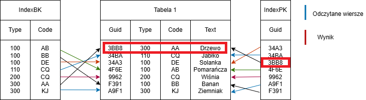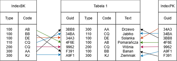 Przykład tabeli z dwoma indeksami Tabela 1 w tym przykładzie posiada dwa indeksy. Indeks BK (Business Key) jest zdefiniowany na atrybutach Type oraz Code, natomiast indeks PK (Primary Key) na atrybucie Guid. Każdy wpis indeksu wskazuje na jeden wiersz tabeli.