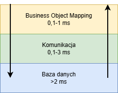 - nakład czasowy związany z komunikacją również zależy od złożoności obiektu biznesowego. W przypadku komunikacji decydującym czynnikiem wpływającym na czas jest rodzaj połączenia sieciowego pomiędzy serwerem aplikacyjnym a serwerem bazy danych. Jeżeli serwer aplikacyjny i serwer bazy danych działają na tym samym komputerze, narzut komunikacyjny jest minimalny.
