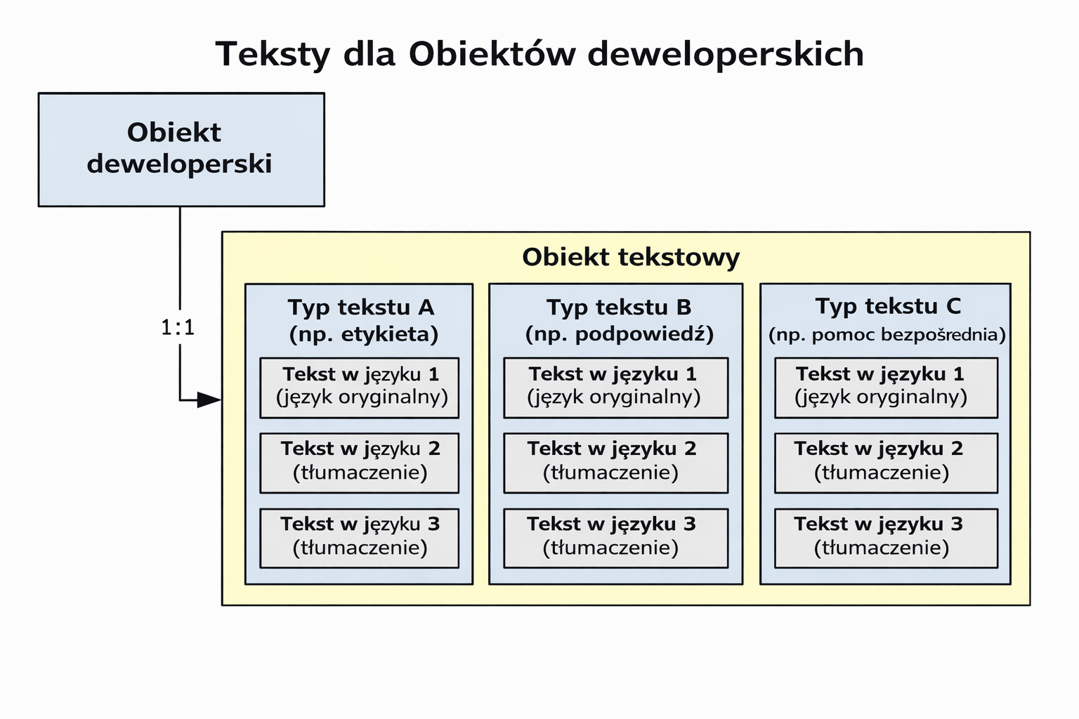 Każdy tekst w interfejsie należy do jednego obiektu deweloperskiego, np. do aplikacji, pola wprowadzania lub ikony. Dla każdego obiektu deweloperskiego, który zawiera tekst wyświetlany w interfejsie i możliwy do przetłumaczenia, istnieje dokładnie jeden dodatkowy obiekt deweloperski typu Tekst (obiekt tekstowy). Pojedyncze teksty mogą być edytowane w aplikacji Obiekty deweloperskie. Teksty nie są edytowane bezpośrednio w danym obiekcie deweloperskim, lecz w powiązanym obiekcie tekstowym. Dodatkowe informacje dostępne są w artykule Obiekty deweloperskie.
