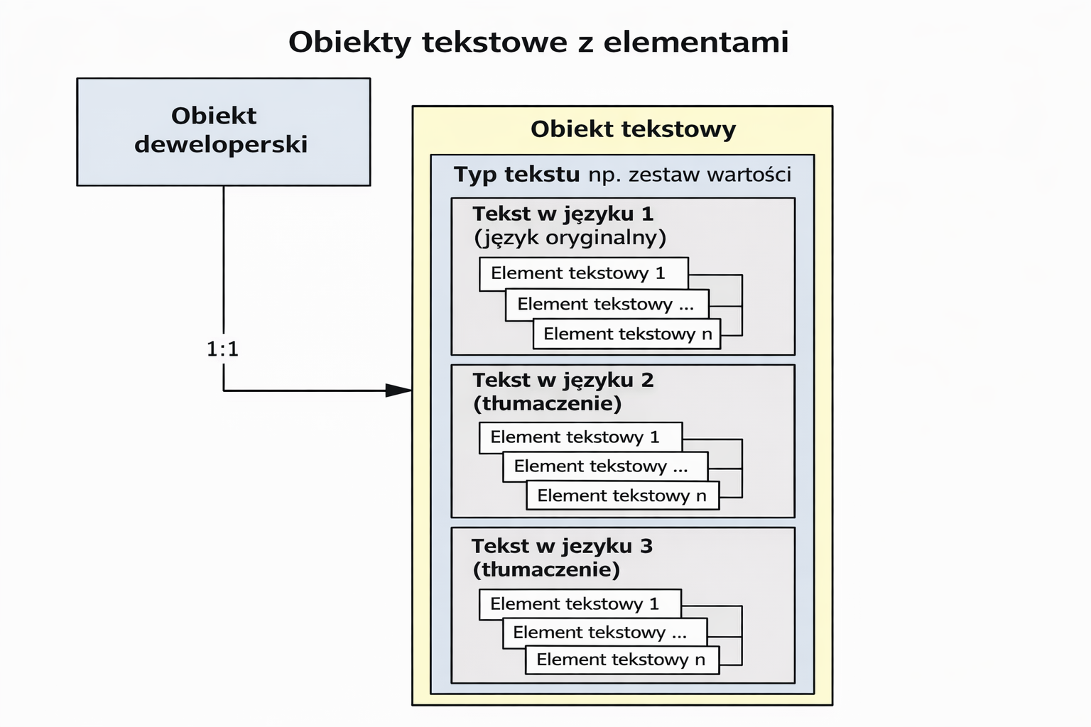 • Obiekt tekstowy – obiektem deweloperski typu Tekst. Obiekt tekstowy jest zawsze przypisany do innego obiektu deweloperskiego i zawiera teksty należące do tego obiektu deweloperskiego we wszystkich językach zarejestrowanych w systemie.