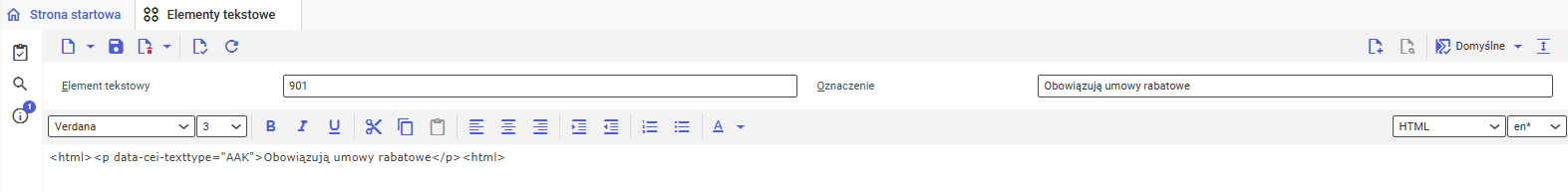 Jeśli użytkownik chce przekazać informacje o rabacie gotówkowym w tej formie, musi użyć warunków płatności zawierających wyłącznie taki formatowy opis. Tekst nie jest przetwarzany, tzn. nie można stosować zmiennych kwot podstawowych.