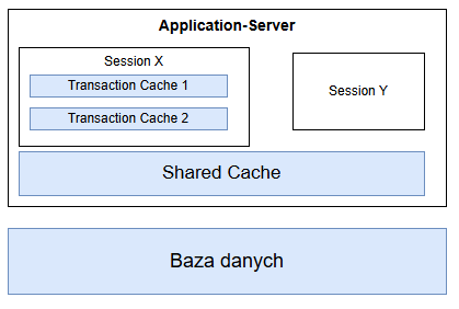 Poniższy schemat przedstawia interakcję między pamięcią podręczną transakcji (transaction cache), współdzieloną pamięcią podręczną (shared cache) i bazą danych.