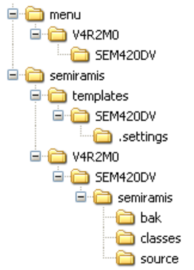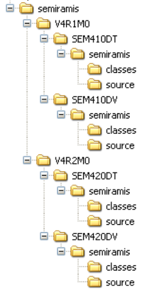 Do rozwoju wymagana jest ustandaryzowana struktura folderów. W przypadku pojedynczej stacji roboczej w systemie Windows oczekiwany jest folder C:\semiramis. Poniżej tego folderu znajduje się podfolder dla każdej wersji. W folderze wydań znajduje się jeden folder na system. W folderze dla systemu znajduje się folder semiramis, w którym znajdują się foldery source dla źródeł i classes dla przetłumaczonych klas. Na komputerze, z którego korzysta kilku użytkowników jednocześnie, np. na serwerze terminali, folder domowy powinien być podłączony jako dysk dla każdego użytkownika. Określoną strukturę folderów można następnie znaleźć na tym dysku.