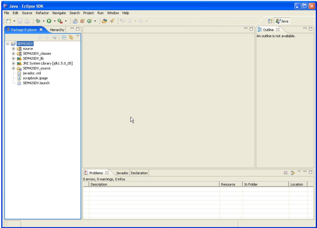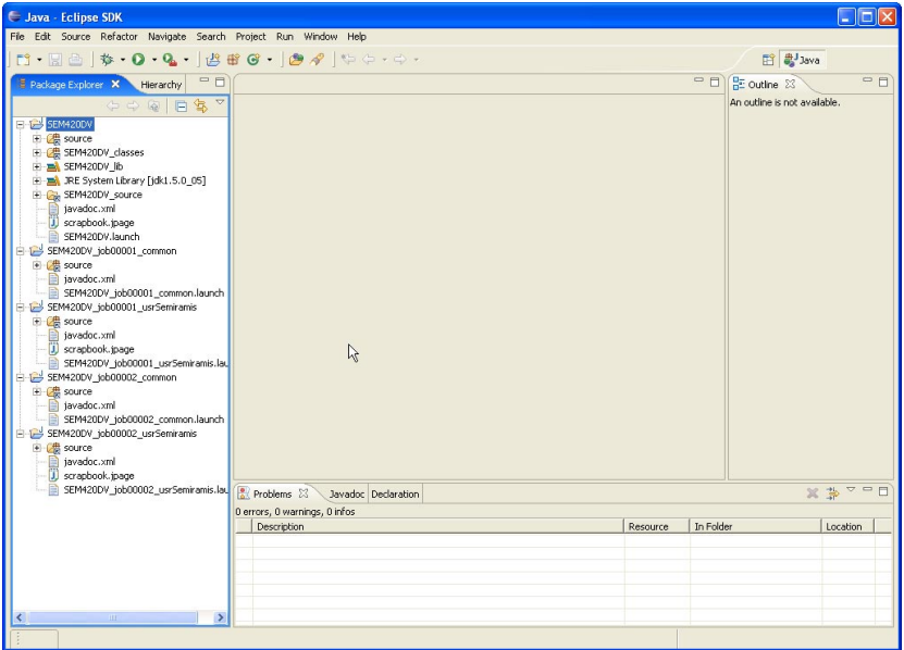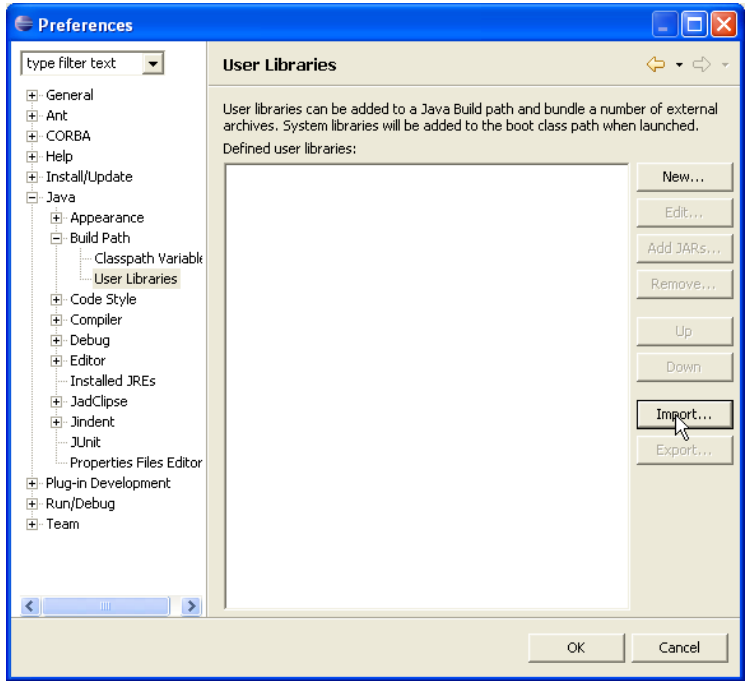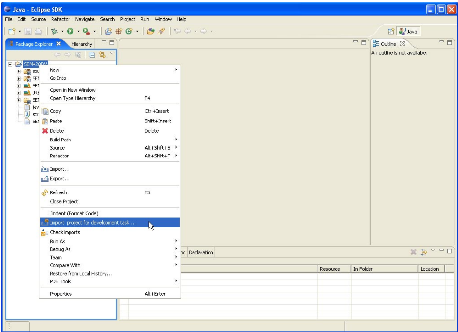 Projekt Eclipse składa się z kilku plików. Pliki te zostały utworzone w folderze C:\semiramis\templates\SEM420DV. Przed zaimportowaniem projektu należy zaimportować bibliotekę użytkownika dla systemu. Import odbywa się poprzez menu Window/Preferences/Java/Build Path/User Libraries/Import.