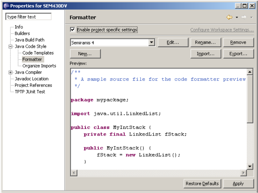 Po zaimportowaniu projektu Eclipse należy skonfigurować formatator kodu źródłowego Eclipse. W tym celu należy otworzyć właściwości formatyzatora poprzez Project/Properties/Java-Code-Style/Formatter: