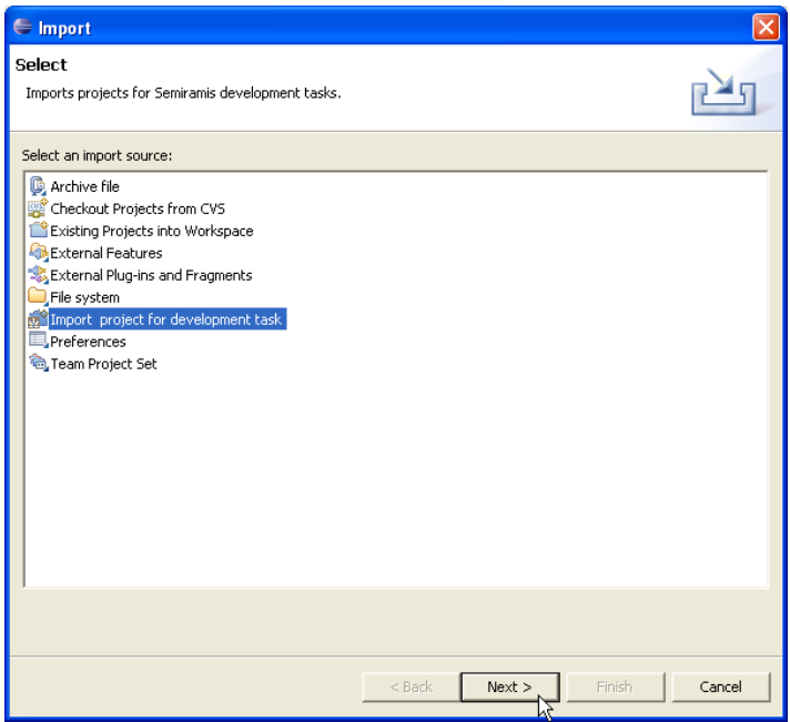 Alternatywnie, w oknie dialogowym importu można uruchomić kreator [Import project for development task]