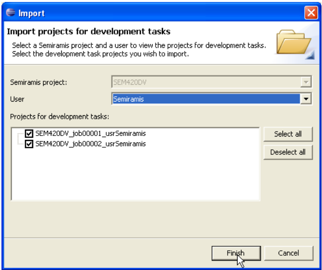 Zadanie deweloperskie użytkownika można teraz zaimportować w oknie dialogowym importu. W tym celu należy wybrać użytkownika i zadanie deweloperskie. Następnie wybrać przycisk [Finish], aby zaimportować zarówno projekt common, jak i projekt użytkownika.