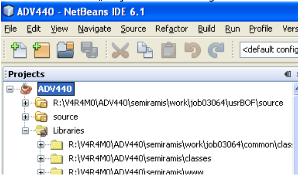 Polecenie crtdvf tworzy pliki projektu w folderze templates/NetBeans, który jest podfolderem folderu określonego parametrem templatesDir. Projekt musi zostać otwarty (menu File->Open Project-> Open Project_Button). W przykładzie, nalezy przejść do folderu projektu C:\semiramis\templates\NetBeans\ADV440 w oknie dialogowym Open Project. Obszar projektu wygląda wówczas następująco: