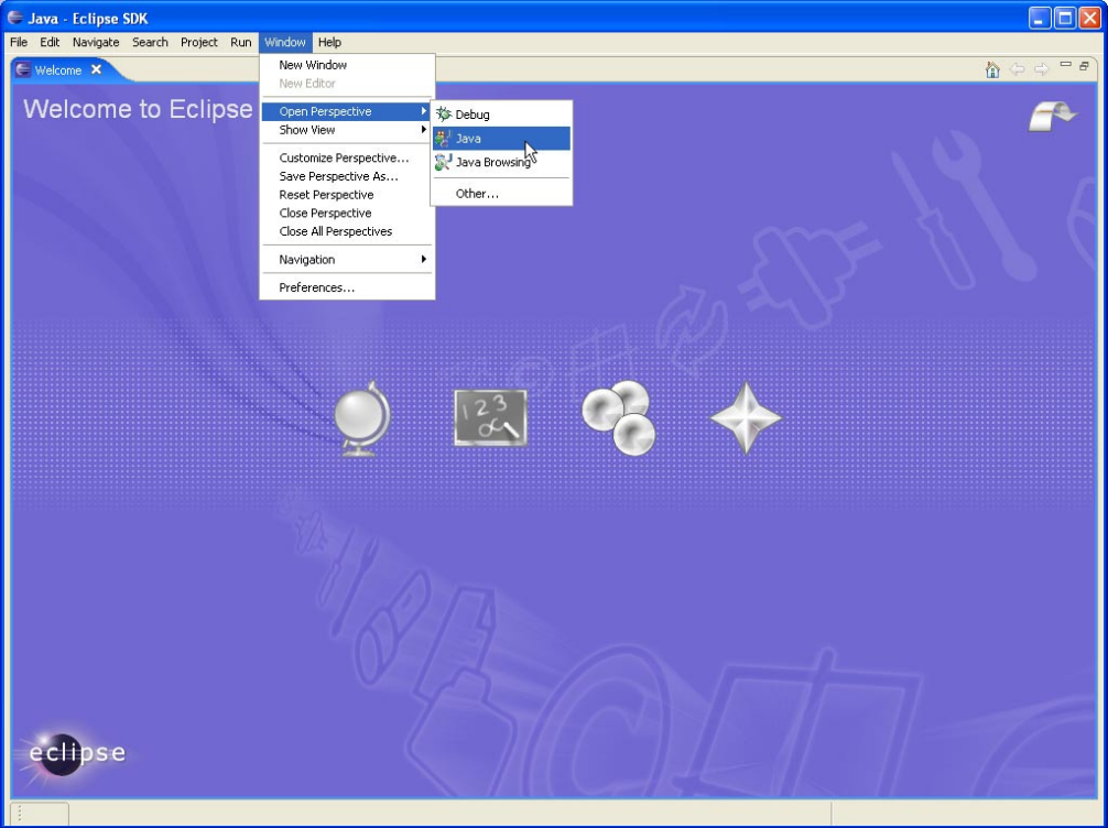 Aby pracować z Eclipse, musi być wybrana perspektywa Java. Perspektywa powitalna musi zostać zamknięta, zanim perspektywa Java stanie się widoczna.