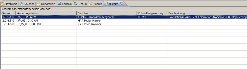 Można wyświetlić istniejące wersje klasy Java lub pliku źródłowego. W tym celu należy otworzyć menu kontekstowe na zakładce Package Explorer na odpowiednim wpisie. W menu kontekstowym pod wpisem Team dostępne jest kolejne menu z wpisem Pokaż wersje Comarch ERP Enterprise. Akcja ta powoduje wyświetlenie wersji na zakładce History.