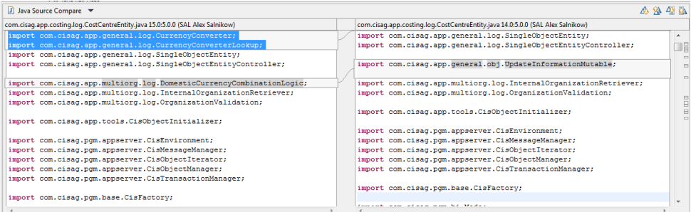 Jeśli zapytano o wersje klas Java, można porównać dwie z nich. Różnice są wyświetlane za pomocą narzędzia porównawczego Eclipse.