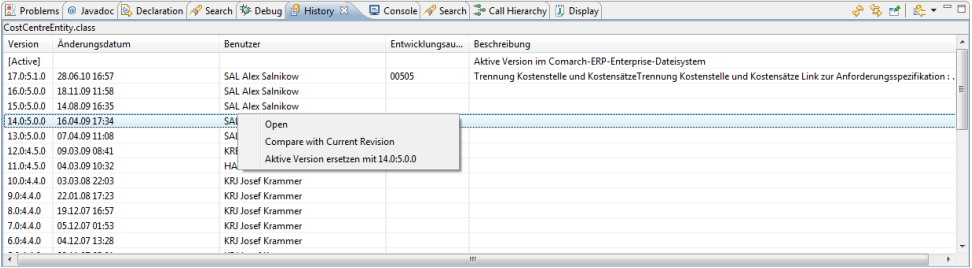 Alternatywnie, indywidualna wersja klasy Java może zostać porównana z bieżącą wersją. W tym celu należy otworzyć menu kontekstowe żądanej wersji. Akcja [Compare with Current Version] jest wybierana z menu kontekstowego.