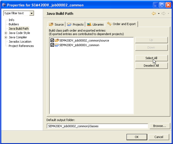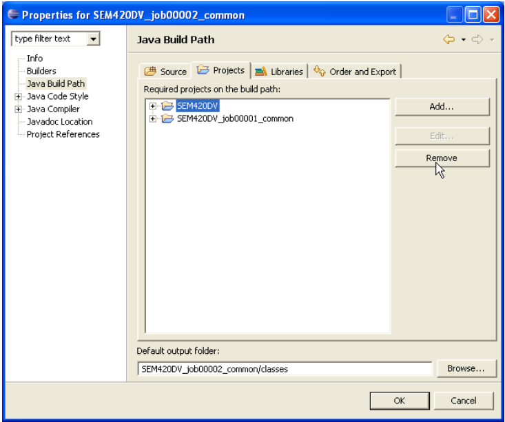 Wspólny projekt zależnego zadania deweloperskiego (2) musi być zależny od wspólnego projektu innego zadania deweloperskiego (1). W tym celu należy dostosować właściwości zależnego projektu. Właściwości można otworzyć za pomocą pozycji menu Properties w menu kontekstowym projektu. Java Build Path musi być wybrana w drzewie i zakładce Projects w obszarze roboczym. Należy użyć przycisku [Add], aby dodać projekt SEM420DV_job00001_common i przycisku [Remove], aby usunąć projekt SEM420DV.