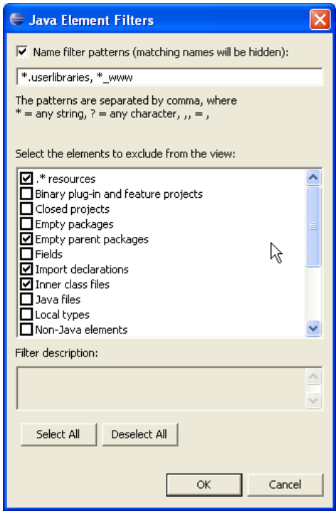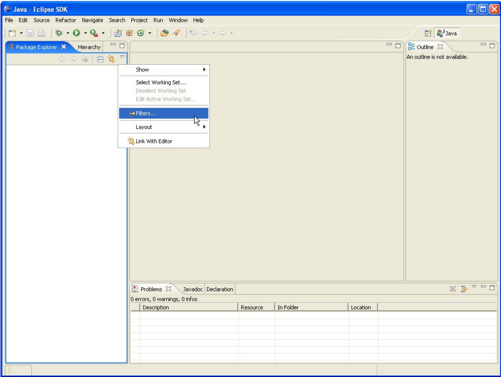 Najważniejszym widokiem w perspektywie Java jest eksplorator pakietów. Jeśli ten widok nie pojawia się po lewej stronie, można go dodać w menu Window/Show View/Package Explorer. Filtr nazw dla *.userlibraries i *_www jest zalecany w eksploratorze pakietów. Filtr można zdefiniować w menu Package Explorer.