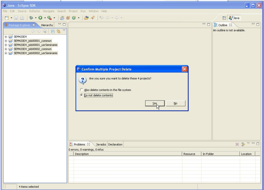Czasami projekt musi zostać usunięty z przestrzeni roboczej Eclipse. Aby to zrobić, należy wybrać projekt w Package-Explorer i wybrać przycisk [Delete]. Można również użyć opcji [Delete] w menu kontekstowym projektu. W następującym oknie dialogowym potwierdzenia, pozycja [Do not delete contents] musi zostać wybrana przed potwierdzeniem okna dialogowego za pomocą przycisku [Yes].