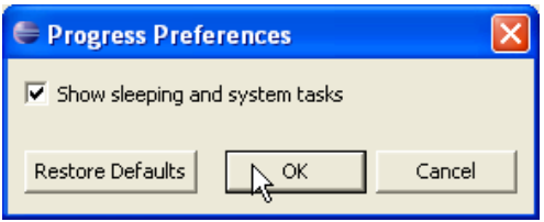 Widok Progress nadal musi być skonfigurowany tak, aby wyświetlane były wszystkie procesy Eclipse. Właściwości można ustawić za pomocą pozycji menu Preferences… w menu widoku. Należy aktywować parametr Show sleeping and system tasks.