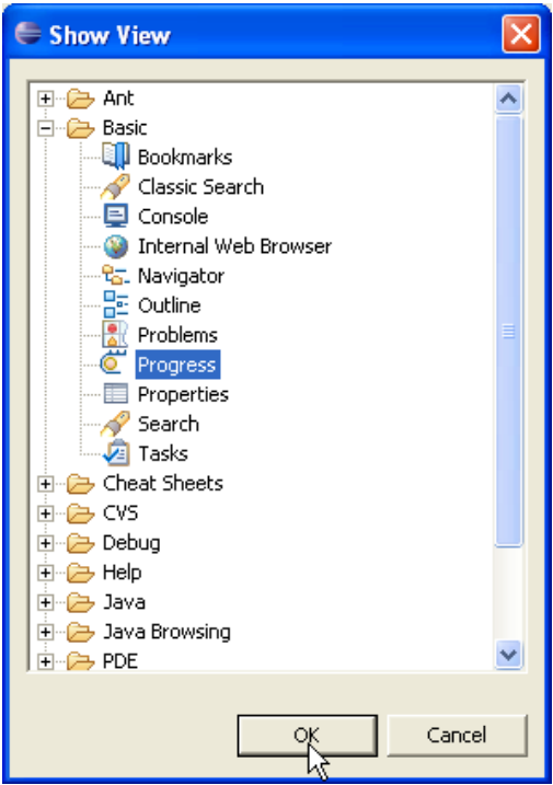 Zwłaszcza po dodaniu projektu lub otwarciu Eclipse może się zdarzyć, że czas reakcji Eclipse nie spełnia oczekiwań. To, czy Eclipse jest zajęty w tle, czy nie, można zobaczyć w widoku Progress. Widok można wybrać w menu Window/Show View/Other…. Widok można znaleźć w drzewie w folderze Basic.