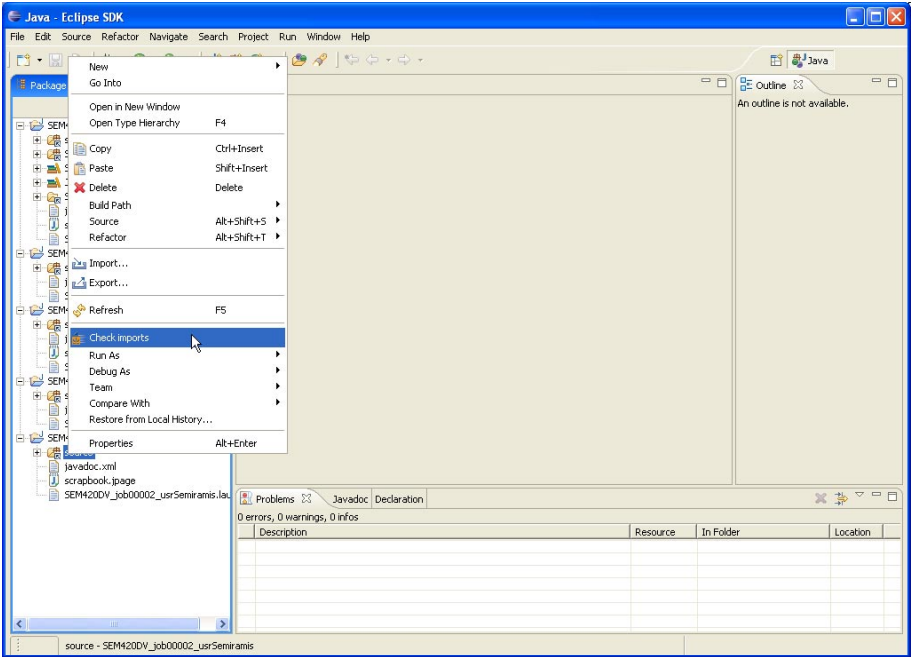 Komponent można wywołać w menu kontekstowym projektu, folderu source, pakietu lub konkretnej klasy Java, wybierając pozycję menu [Check imports].