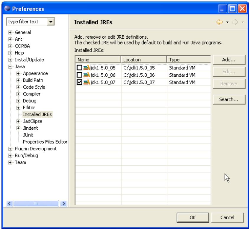 Następnie należy zdefiniować JDK. Definicji dokonuje się w menu Windows/Preferences/Java/Installed JREs. Standardowy JDK można zdefiniować za pomocą akcji [Dodaj]. Nazwa JDK powinna zawsze zawierać wersję aktualizacji, np. jdk1.6.0_35.