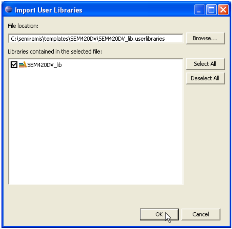 Plik do zaimportowania z biblioteką użytkownika dla projektu nosi nazwę C:\semiramis\templates\SEM420DV\SEM420DV_lib.userlibraries dla przykładu pokazanego w poprzednim rozdziale.